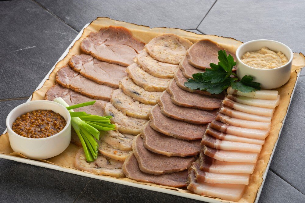 Рулет куриный, буженина, язык отварной, сало соленое
