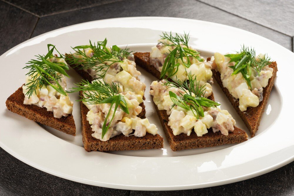 Сельдь слабосоленая, яблоко, лук красный, зелень, бородинский хлеб