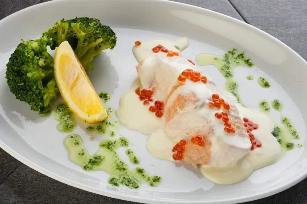 Лосось, икра лососевая, брокколи, крем сливочный, зелень, лимон