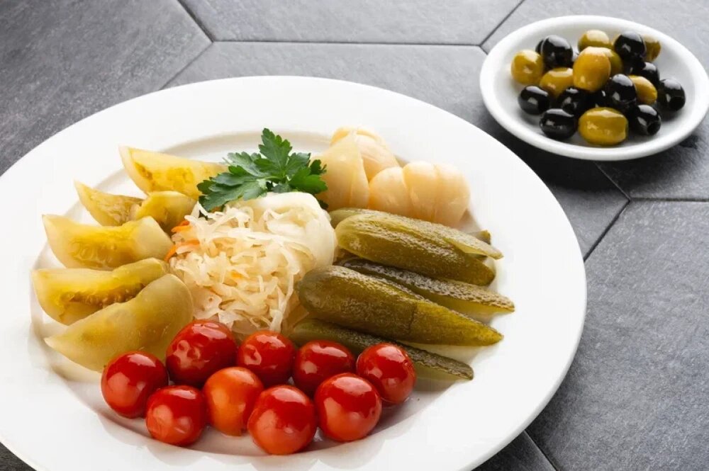 Капуста квашеная, огурцы и помидоры бочковые, черри консервированные, маринованный чеснок, зелень