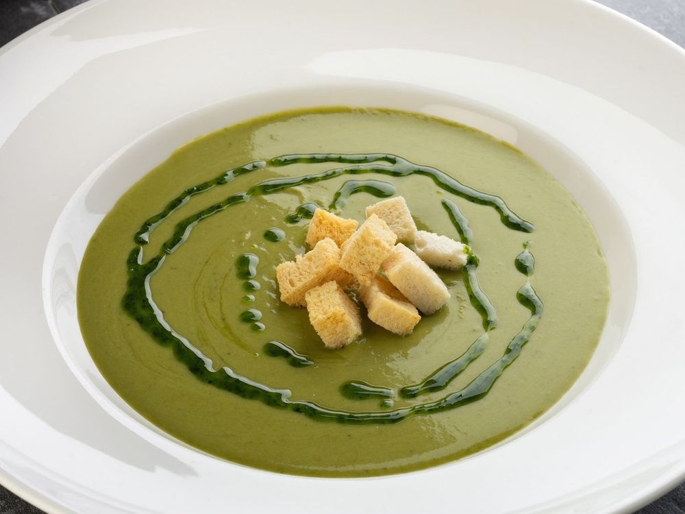 Брокколи, картофель, сливки, масло зеленое, гренки