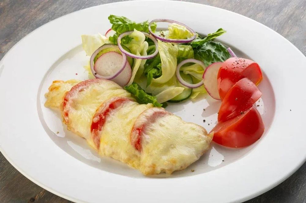 Куриное филе, запеченное с моцареллой и помидорами