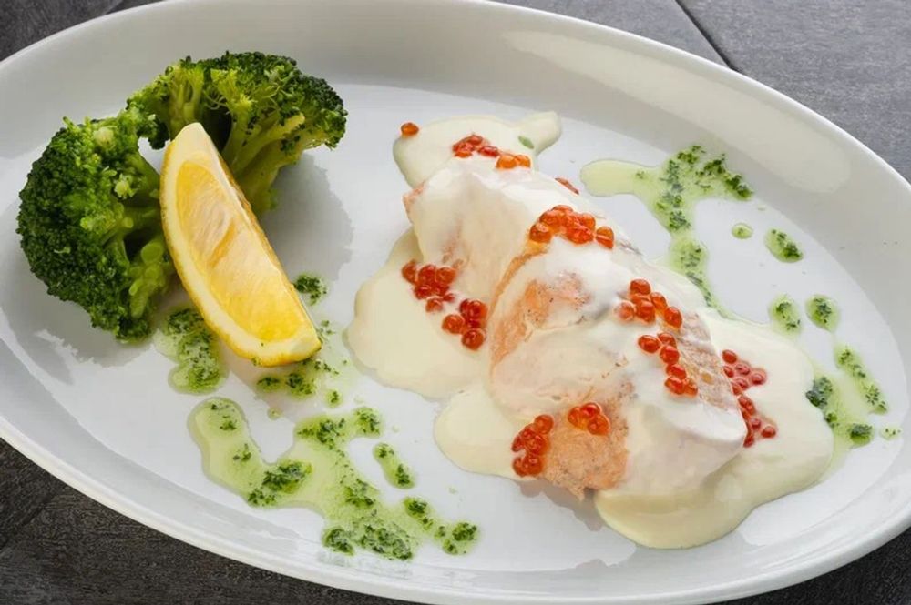 Лосось, икра лососевая, брокколи, крем сливочный, зелень, лимон