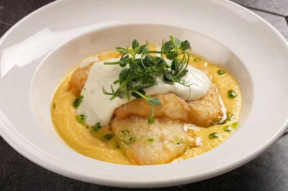 Пюре из цветной капусты, филе палтуса, микрозелень