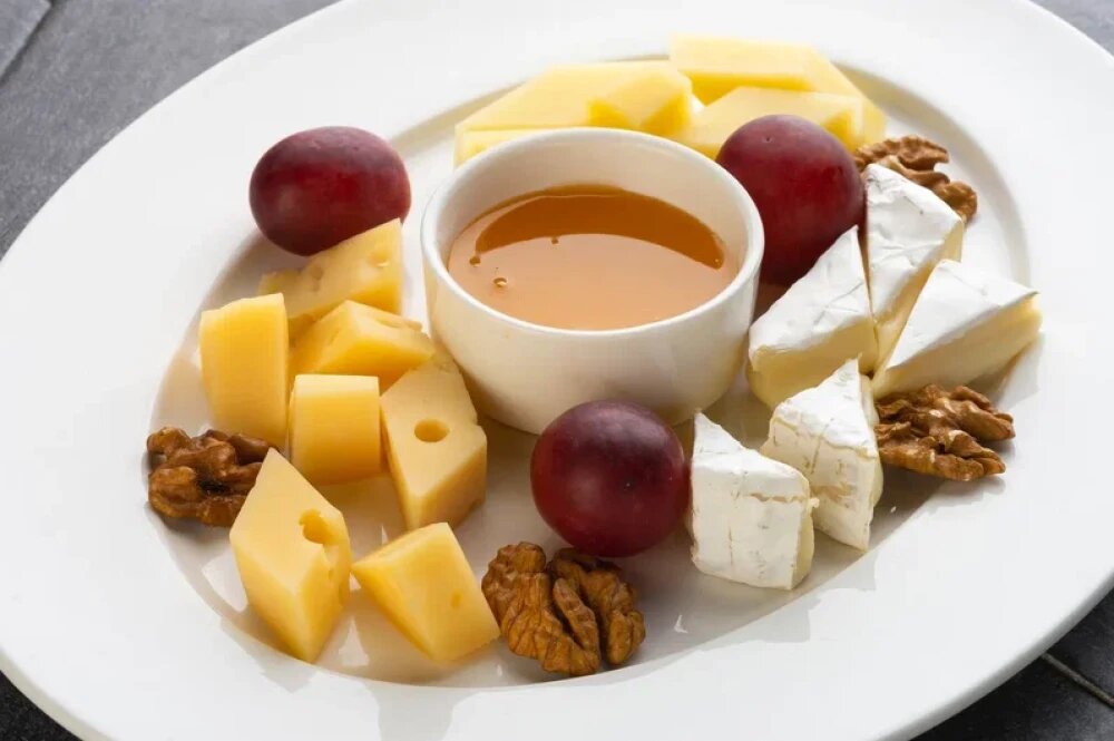 Камамбер, маасдам, пармезан, грецкие орехи, мед, виноград