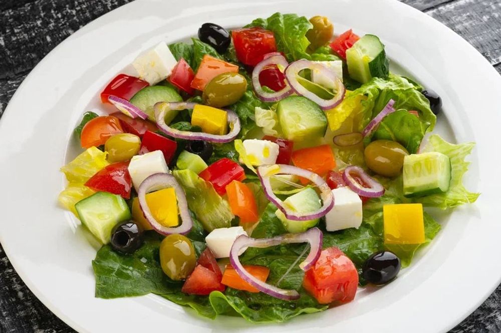Лук красный, масло оливковое, перец болгарский, помидоры, огурец, сыр фета, оливки зеленые, оливки черные, микс-салата