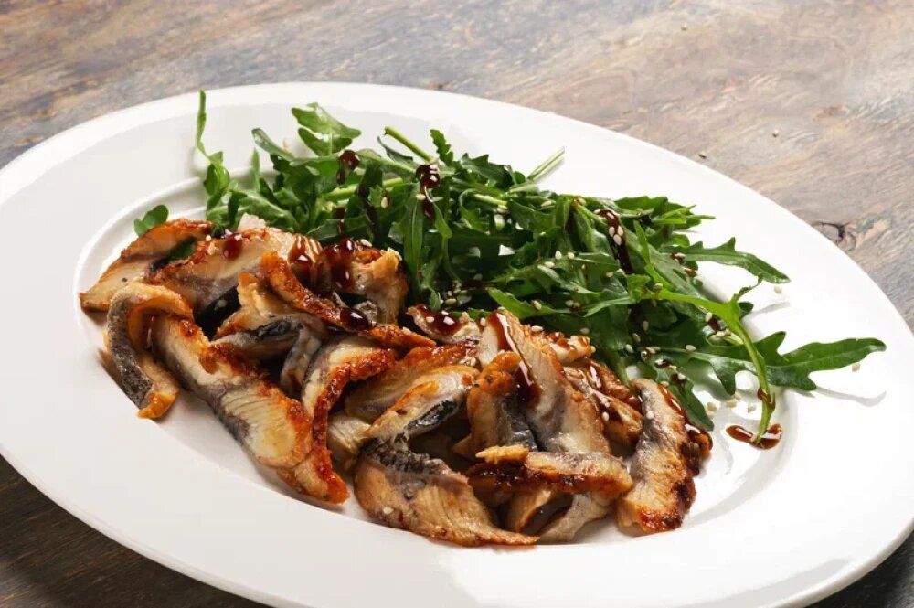 Угорь, соус терияки, рукола