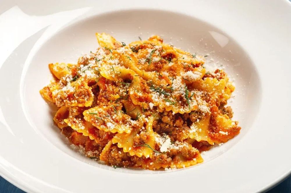 Свинo-говяжий фарш, пармезан, лук, соус пилати, зелень, паста