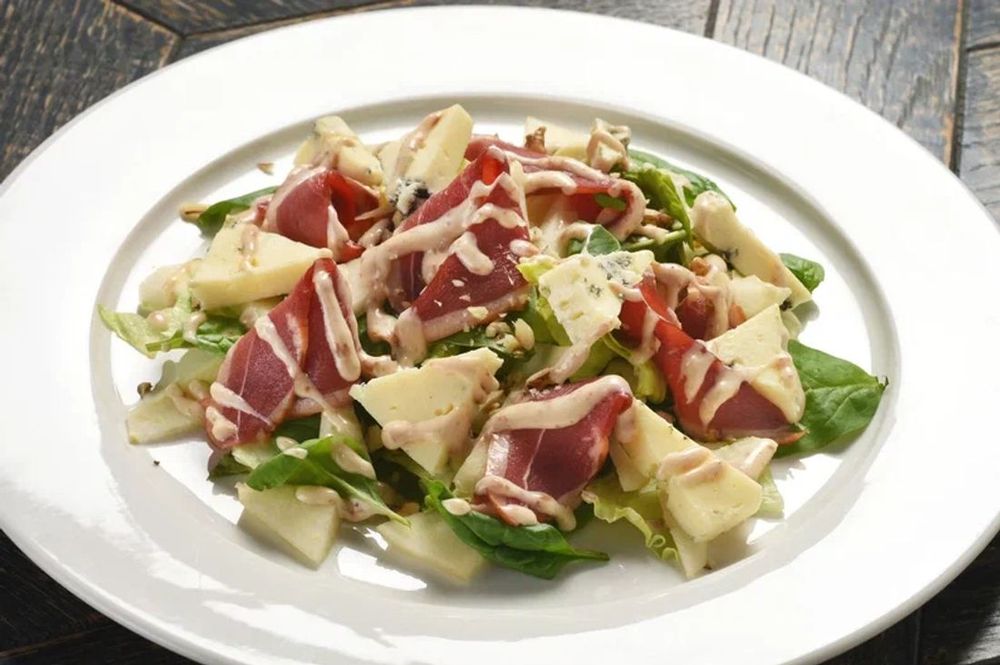 Утиная грудка холодного копчения, шпинат, груша, микс салатный, сыр с голубой плесенью, орех грецкий, соус ореховый