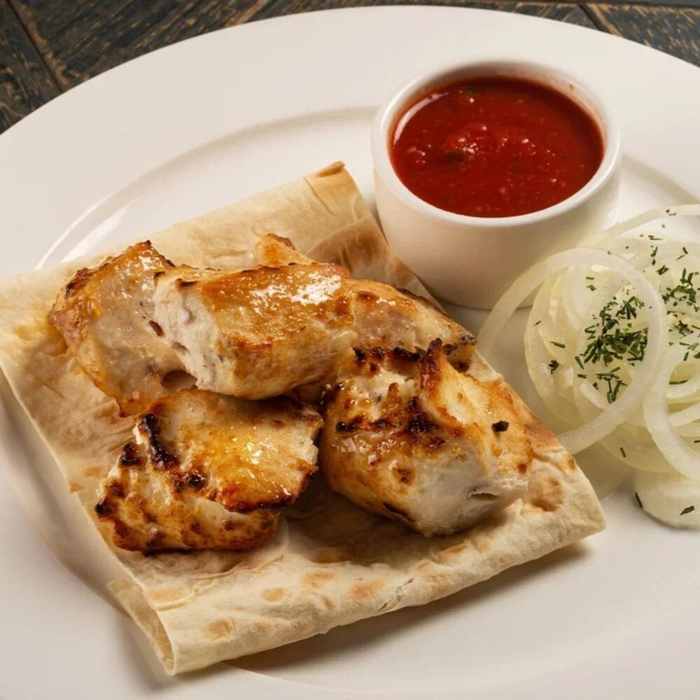 Подается с шашлычным соусом, лавашом и луком.