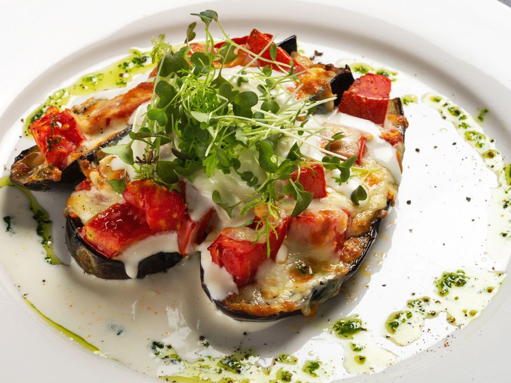 Баклажаны, помидоры, сыр моцарелла, сыр страчателла, перец черный, микрозелень, масло зеленое