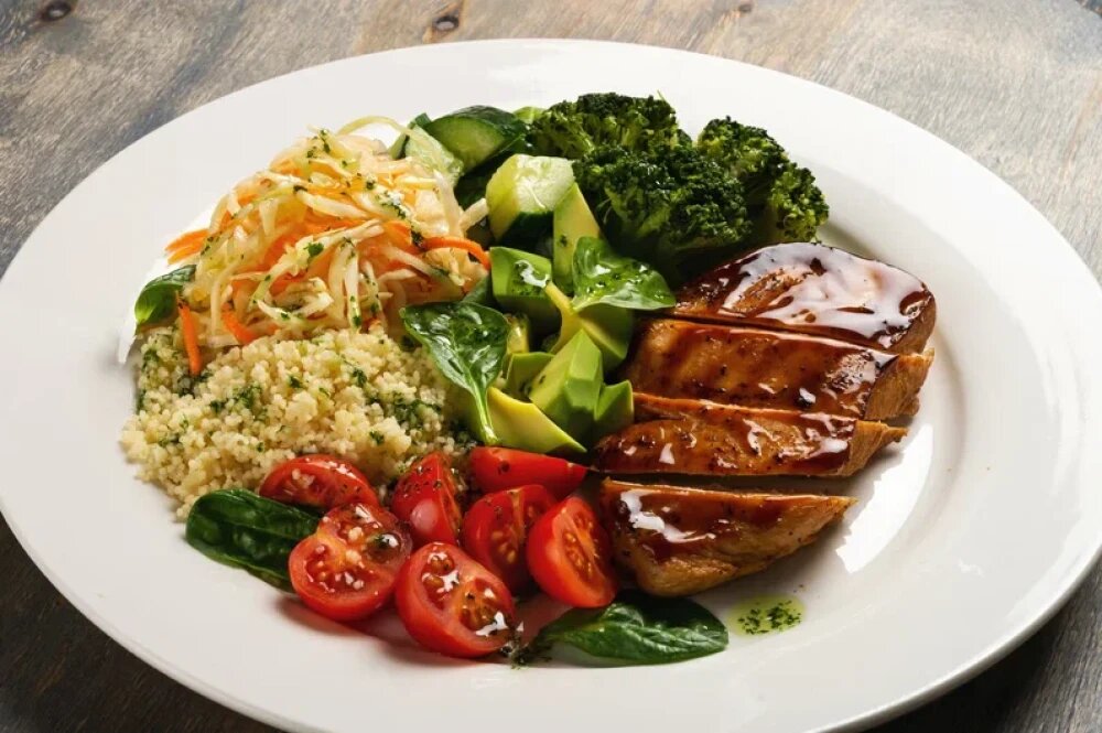 Куриной филе, соус терияки, помидоры черри, брокколи, кускус, авокадо, шпинат свежий, огурец свежий, зеленое масло