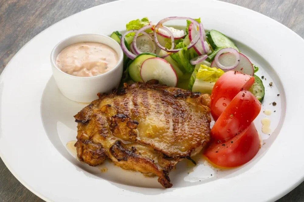 Бедро цыпленка, микс салата, помидоры, редис, огурец свежий, красный лук, соус андалузский