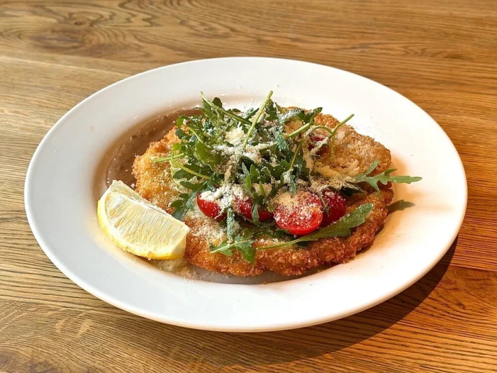 Свиная вырезка, яйцо, сухари панировочные, соль, перец, демиглас, сельдерей, помидоры черри, руккола, пармезан, лимон, масло оливковое
