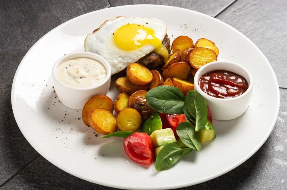 Свинина, яйцо, огурец свежий, помидоры, шпинат, соус барбекю, соус сливочно-горчичный, картофель бэби, говядина