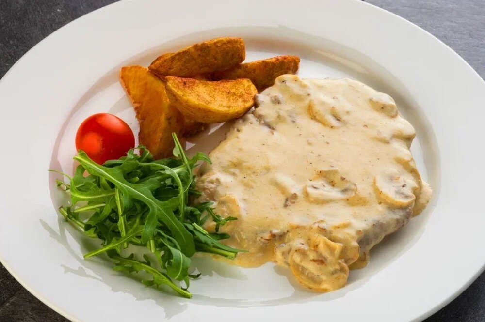 Говядина, шампиньоны, сливочный крем, картофель, руккола, помидоры черри